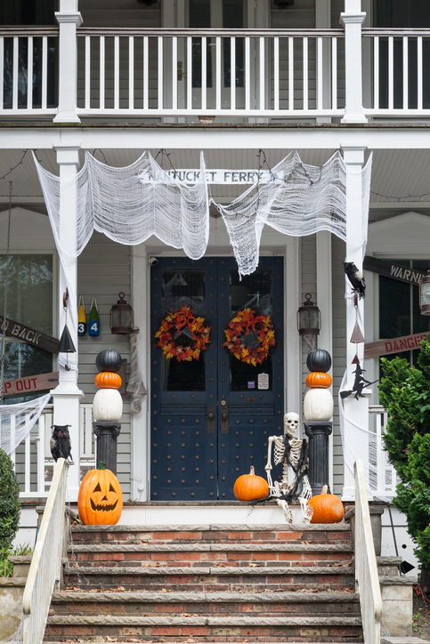 Decoraciones de Halloween que no dan miedo, no son dignas de la noche de brujas. Telarañas, insectos de plásticos, esqueletos. Usa todo lo que puedas para darle es aspecto de película a tu casa.